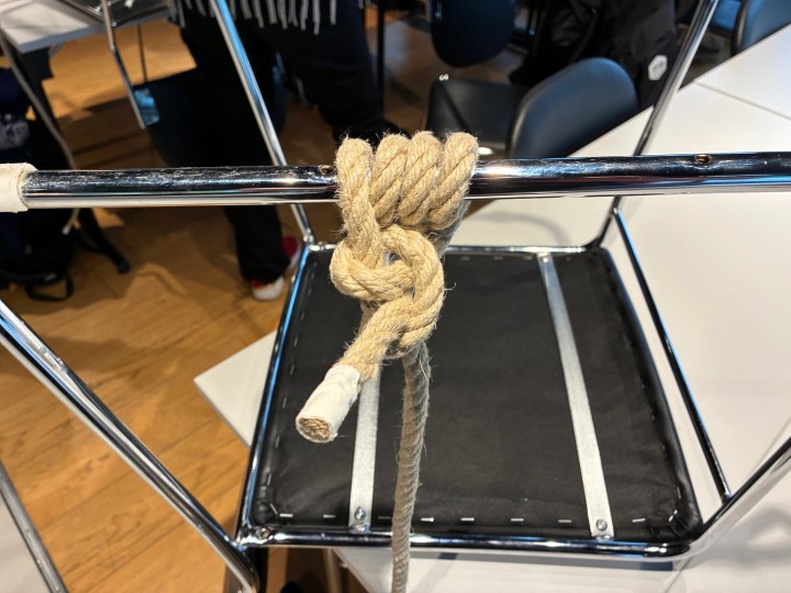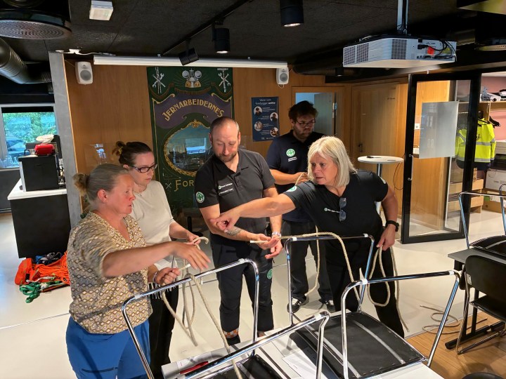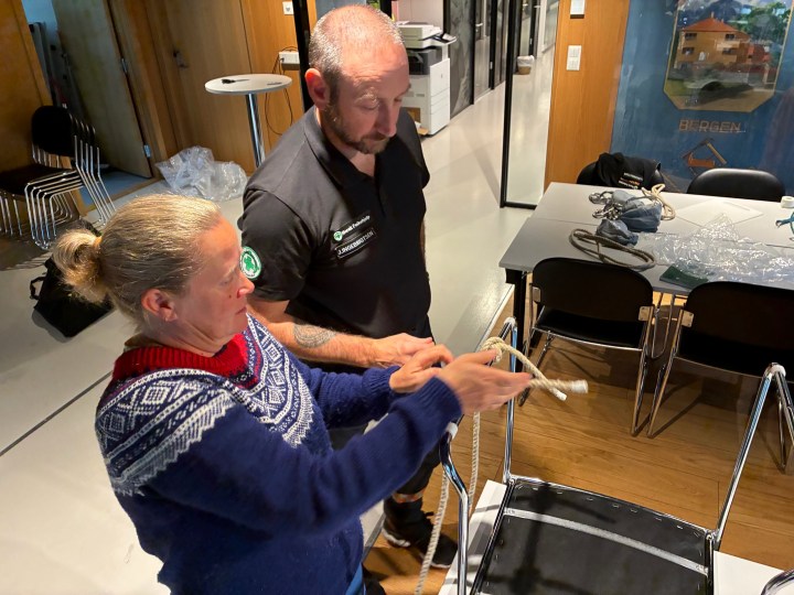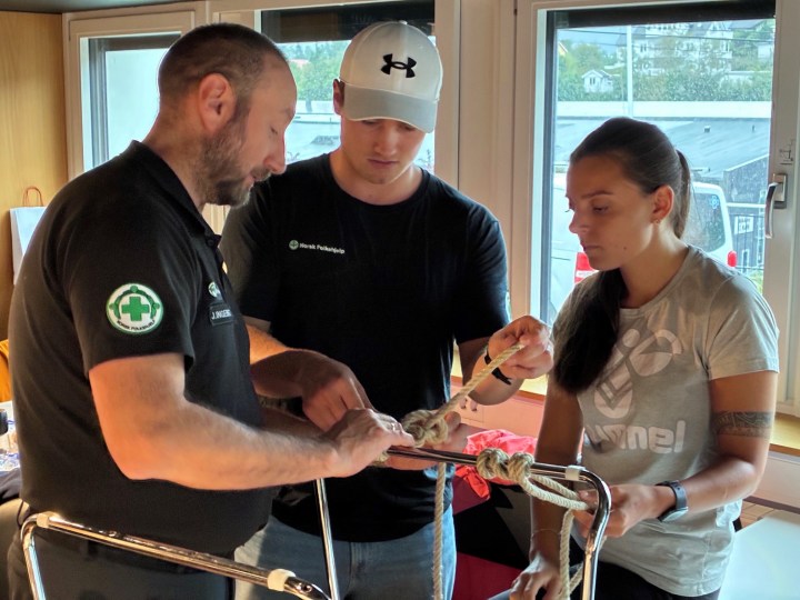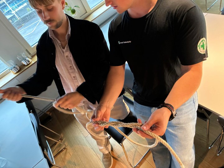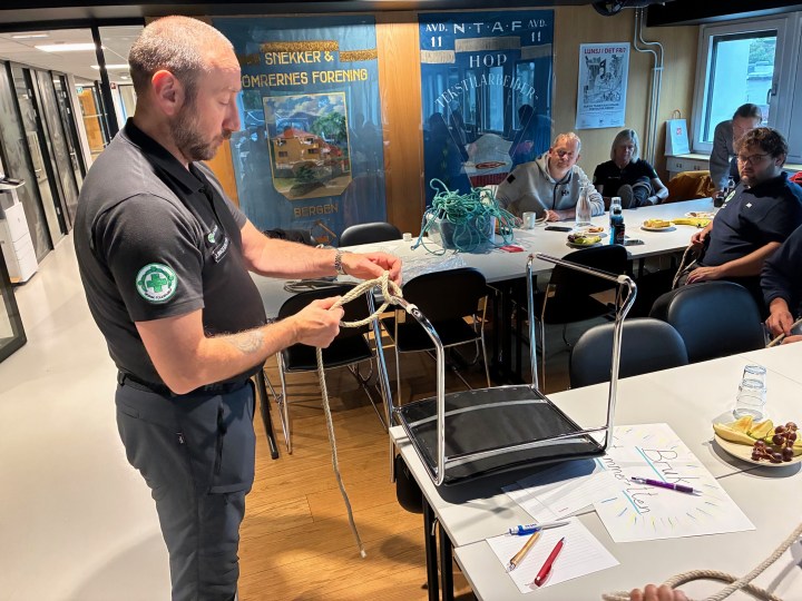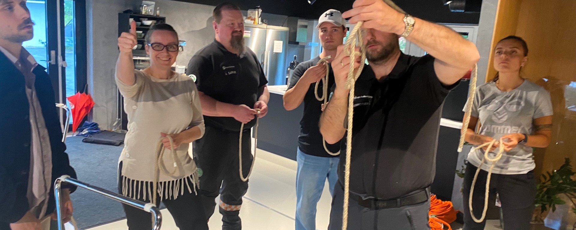 Taustøtte er en fascinerende ting. Hvordan kan vi bruke dette når vi er på aksjoner, rett og slett. Så her ble det trent på en rekke knuter og knopp og stikk og hva det nå heter alt sammen.