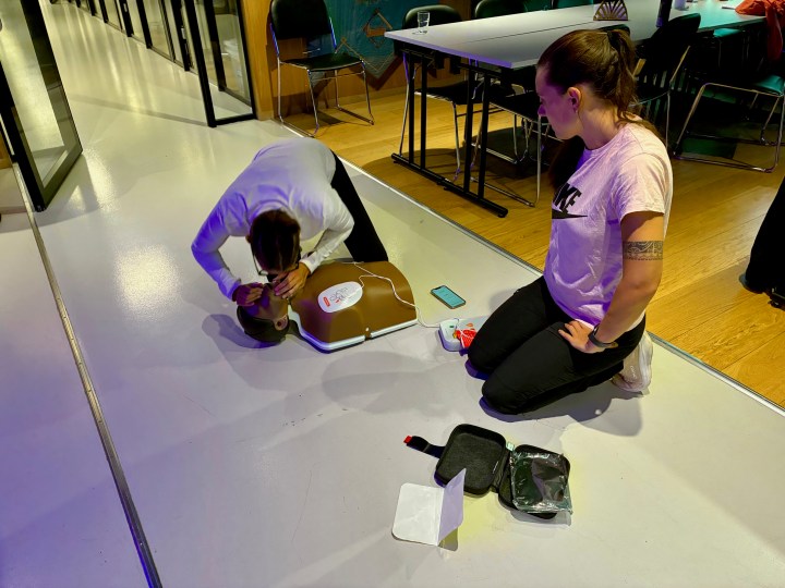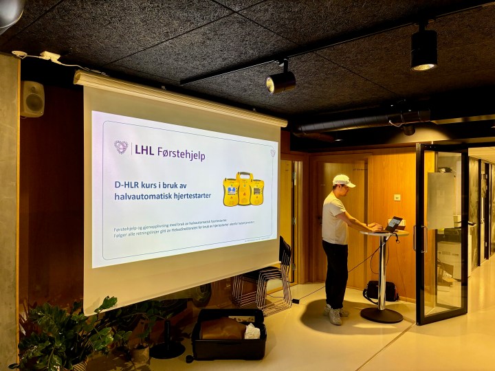 Erik ledet oss fint gjennom seansen både med presentasjoner hvor han viste på dukke hvordan HLR uføres, hvordan hjertestarter fungerte. Litt grunnleggende teori om temaet ble det og plass til.
