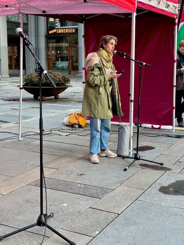 Dagens apell ble holdt Line Khateeb, leder i Palestinakomiteen. En enorm apell som ble avbrutt av applaus og trampeklapp flere ganger.
